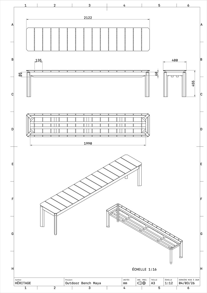 je suis dans un projet de bancs extérieurs en robinier. j'ai dessiné ceux-ci d'après un modèle de table avec laquelle ils vont être utilisés. voici un petit rendu et un schéma pour situé l'objet.