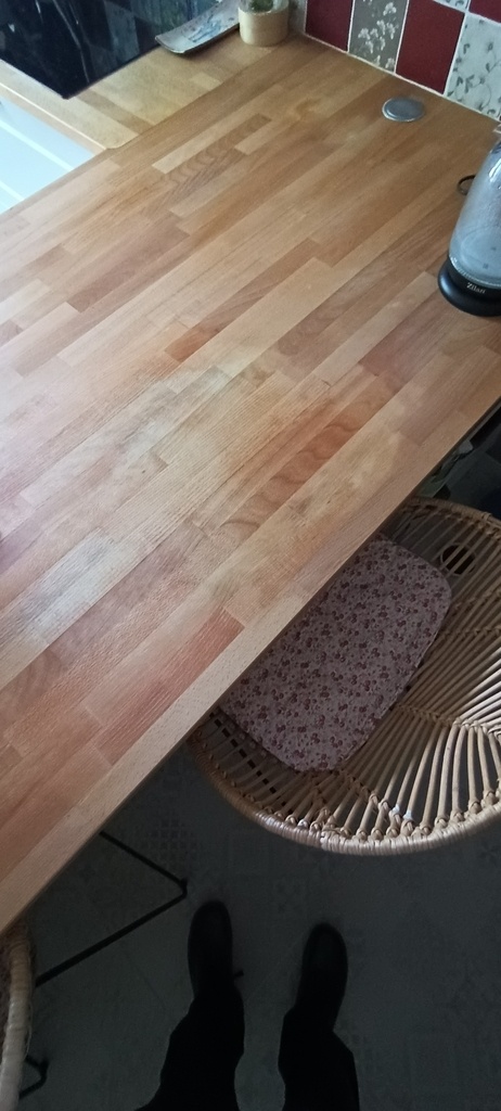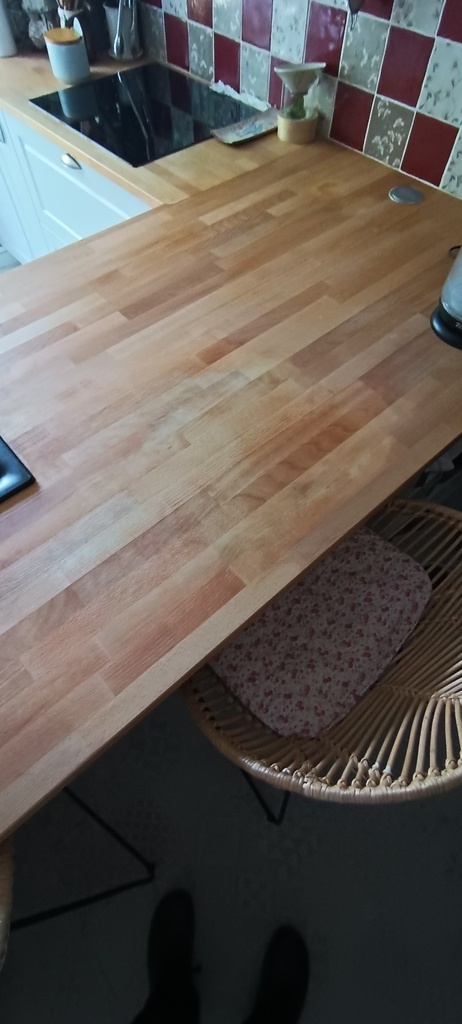 mon voisin et néamoins ami me pose une colle. Son plan de travail de cuisine en abouté (hêtre à priori) protégé par de l'huile de lin a été taché par du thé. Après quelques essais de ponçage, de nettoyage à l'eau oxygénée le résultat présente encore des auréoles (voir photos) . Y a-t-il une solution pour revenir à un état plus satisfaisant, proche d'avant la catastrophe ?