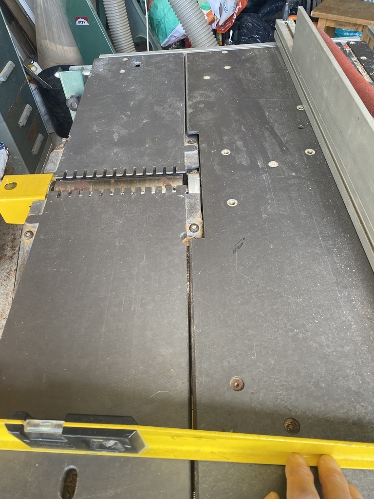 Perso mon combiné est un Lurem, pour régler le genre de soucis que tu as si je lève ma table d'entrée elle est fixée au bâti par 3 boulons (en bas de la photo). En desserrant les 2 bleus légèrement et le rouge très très légèrement, je suis capable d'orienter ma table afin de la faire plus ou moins piquer du nez dans un sens ou un autre (l'idée étant évidemment de l'orienter pour qu'elle ne pique du nez dans aucun sens). Quand je suis bon (c'est plus facile à 2 de le faire) je ressers tout et vraiment fort, mais vraiment, j'ai une clé à levier long pour multiplier la force.
