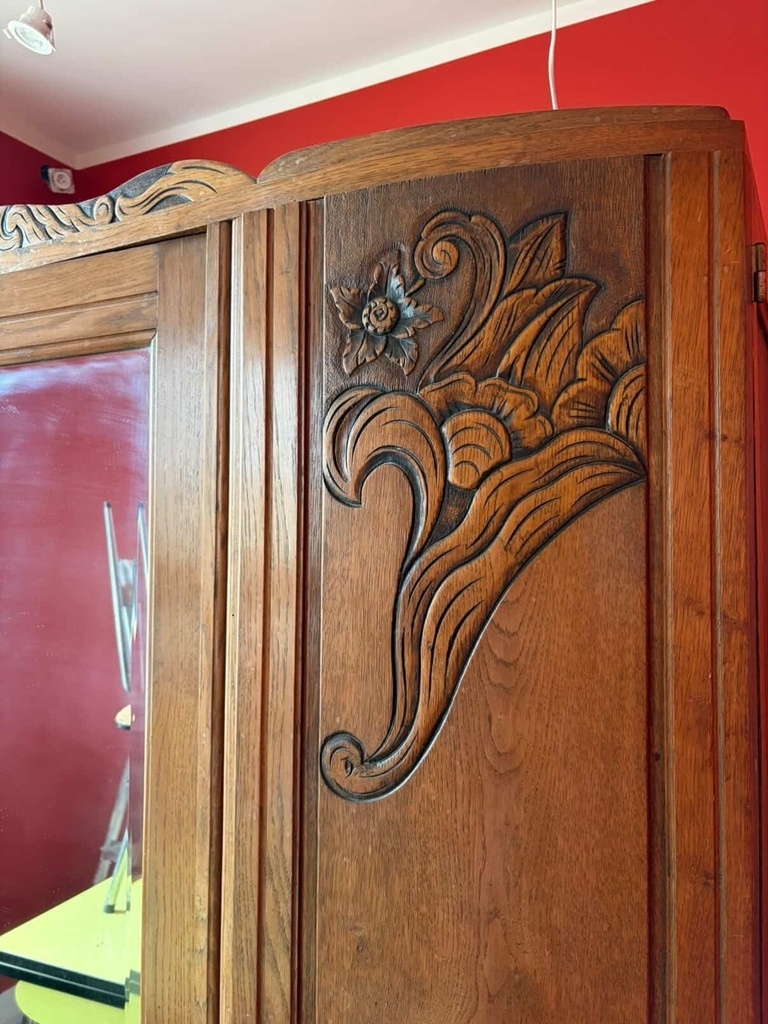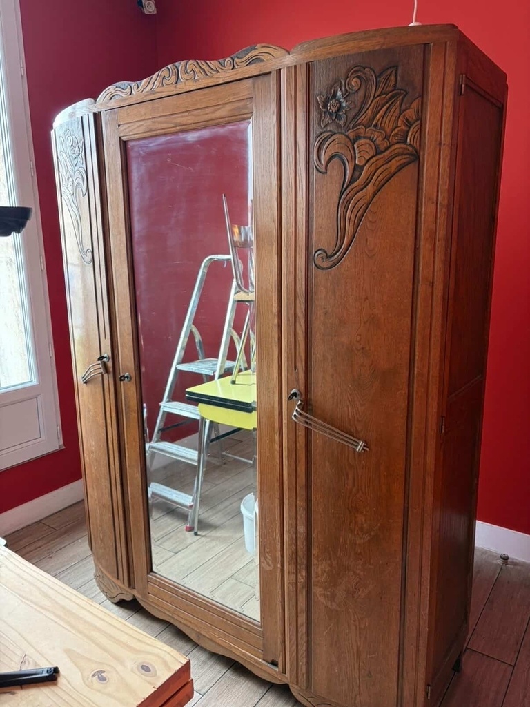 Il ne faut surtout pas poncer car vous allez enlever la patine du meuble. cette armoire n'est pas art nouveau mais aux environs de la seconde guerre mondiale, elles sont généralement vernies.
