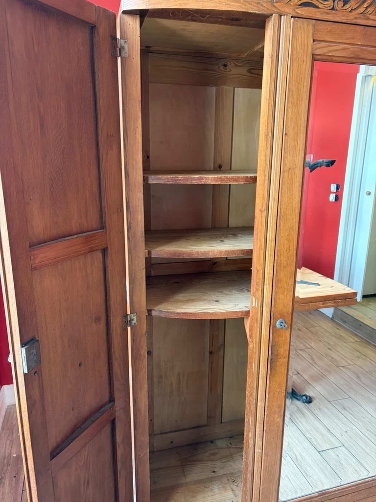J'ai récemment récupéré une armoire art nouveau dans un restaurant qui faisait des travaux. L'armoire est un peu sale, elle a un peu souffert de projection de liquide (peut être de nettoyage) dans le restaurant (il y a des traces sur les portes) et elle a des vrillettes. L'armoire est entièrement démontable en panneaux faciles à manipuler, ce qui est très appréciable. Je souhaiterai la remettre propre et saine pour l'utiliser dans notre chambre, je ne cherche pas pour autant à effacer totalement son histoire en la mettant à nu, je sollicite votre avis pour savoir comment m'y prendre.