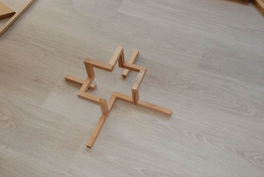 Bonjour, je cherche à réaliser la structure que vous voyez dans l'image: 12 poteaux identiques, assemblés en bout en faisant une rotation de 90° à chaque fois. Pour l'instant, la destination de celle-ci est de gloriette, pergola, tonnelle, kiosque... je ne sais pas comment l'appeler.