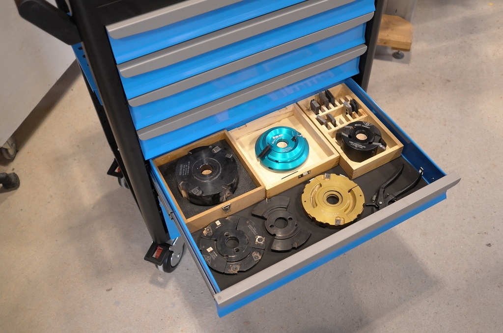Avec ma scie à format/toupie, lorsque je retire le protecteur de toupie avec son guide de toupillage (25 kg) pour utiliser pleinement la scie à format, je ne sais jamais où le poser sauf à encombrer inutilement des plans de travail toujours trop peu nombreux. J’envisagerais de faire l’acquisition d’une servante d’atelier mobile à tiroirs, permettant de poser l’engin, mais également de ranger toutes les toupies et accessoires, y compris les fraises de la défonceuse et les mèches de perçage.