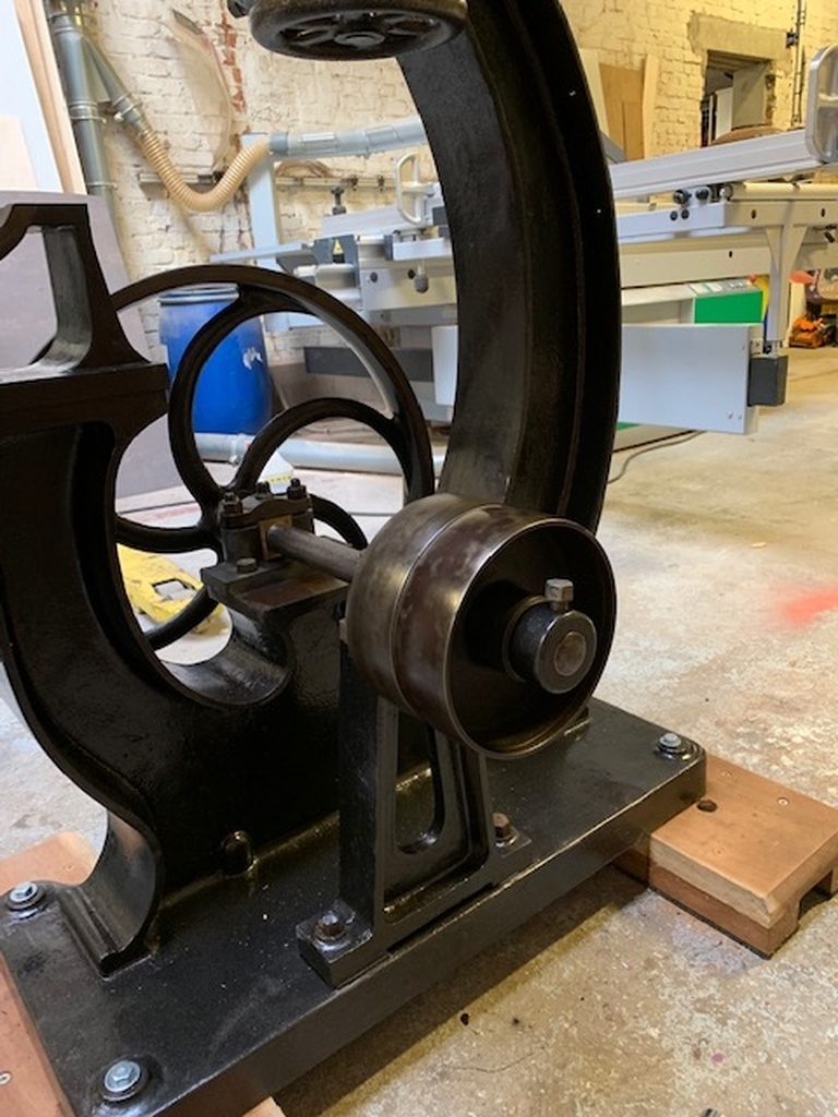 Les volants font 580 mm de diamètre, les palier bas sont en bronze. le volant haut tourne sur un axe simplement graissé, la boulonnerie est en pas métrique.