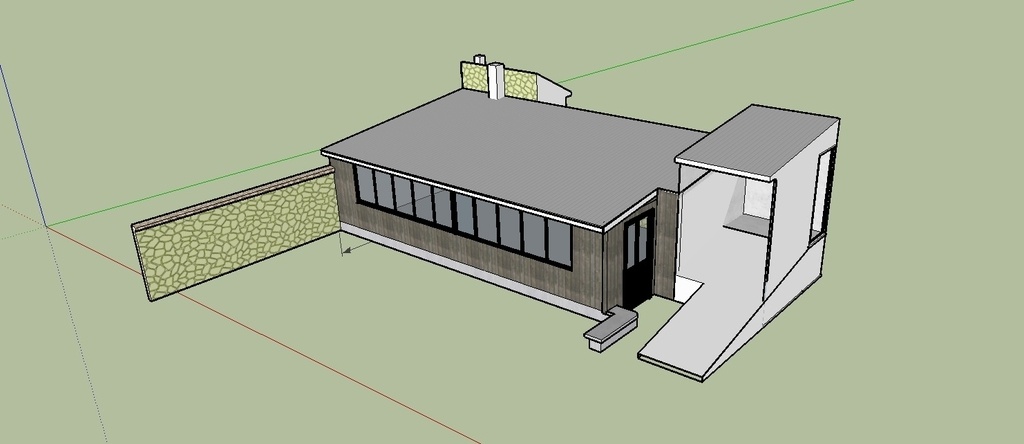 Le batiment actuel (voir photo) comporte une partie ouverte et une partie fermée séparées par un mur en parpaing. Le tout avec une toiture mono pente en shingle qui fuit.