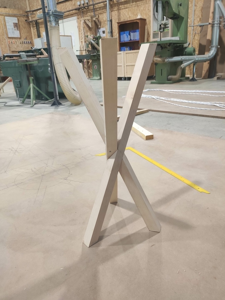 Je me suis attaqué à un tréteau de Buenos Aires. Je commence modeste : 3 pieds, faces aplomb, et déjà des soucis. Je n'ai pas pris de photos du dessus, et il est démonté... Mais il y a un gros jour entre les pieds, je pense qu'il y a une espèce de barbe à faire sur chaque pied pour éviter ça, mais je ne vois pas où la tracer.