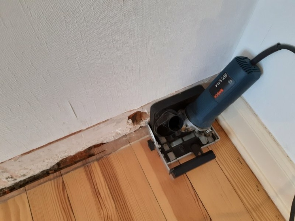 Je privilégierais la scie circulaire. Avec la TS55, on peut être à 12mm du mur (pour les autres modèles je ne sais pas), mais décoller un peu du mur pour ne pas risquer de coincer la lame. L'avantage d'utiliser un rail est de garantir une coupe droite.