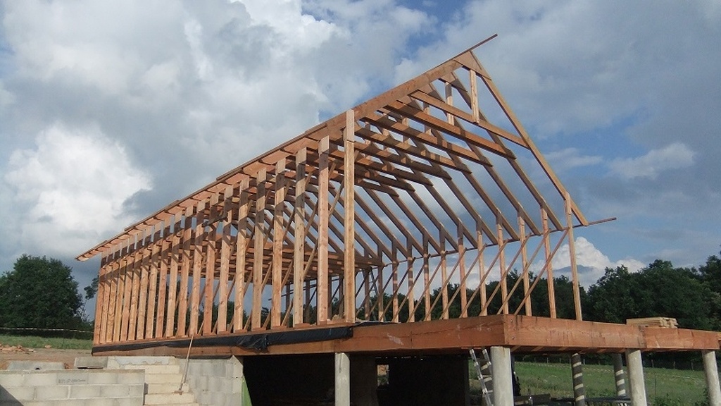 Phase 3: fermettes. - après avoir été assemblées à l'étage, les fermettes ont été levées dans la foulée.