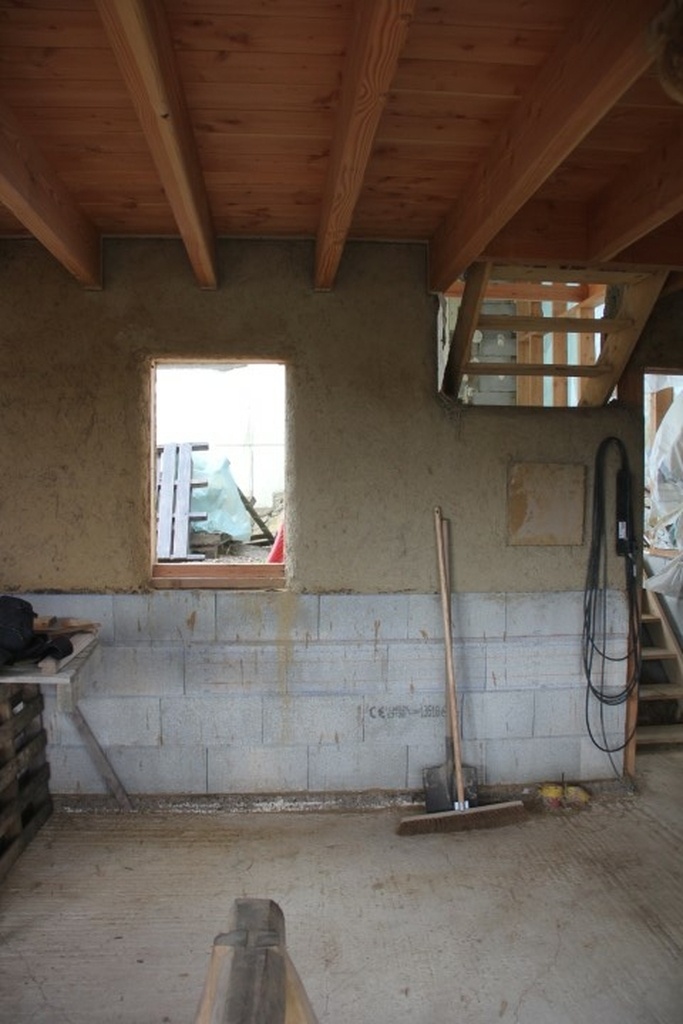 - remplissage de l'ossature par un mélange de paille-terre banché allégé (330kg/m³ environ)