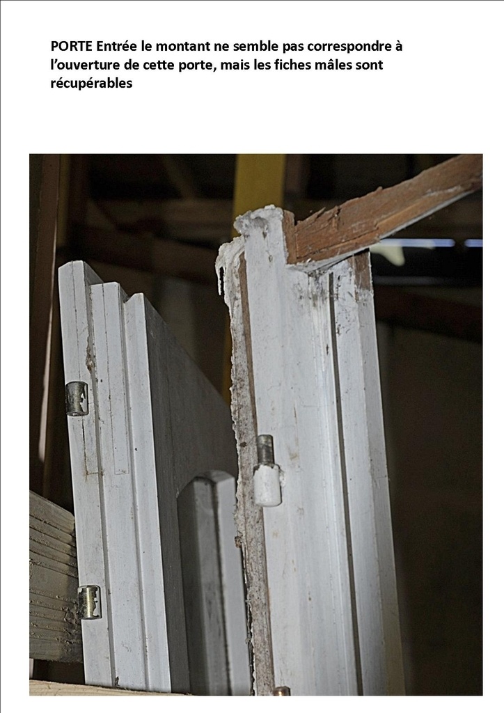 Problème 1 pour la porte entrée, le reste d’un montant avec fiches mâles, mais montant inutilisable car abîmé lors du démontage, et peut être pas le bon (la porte s’ouvre vers l’intérieur et vers la droite depuis l’intérieur, le montant semble être celui d’une autre porte) - photo