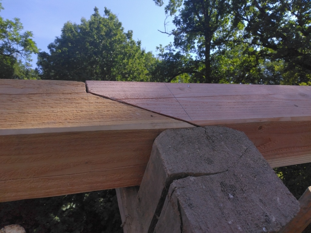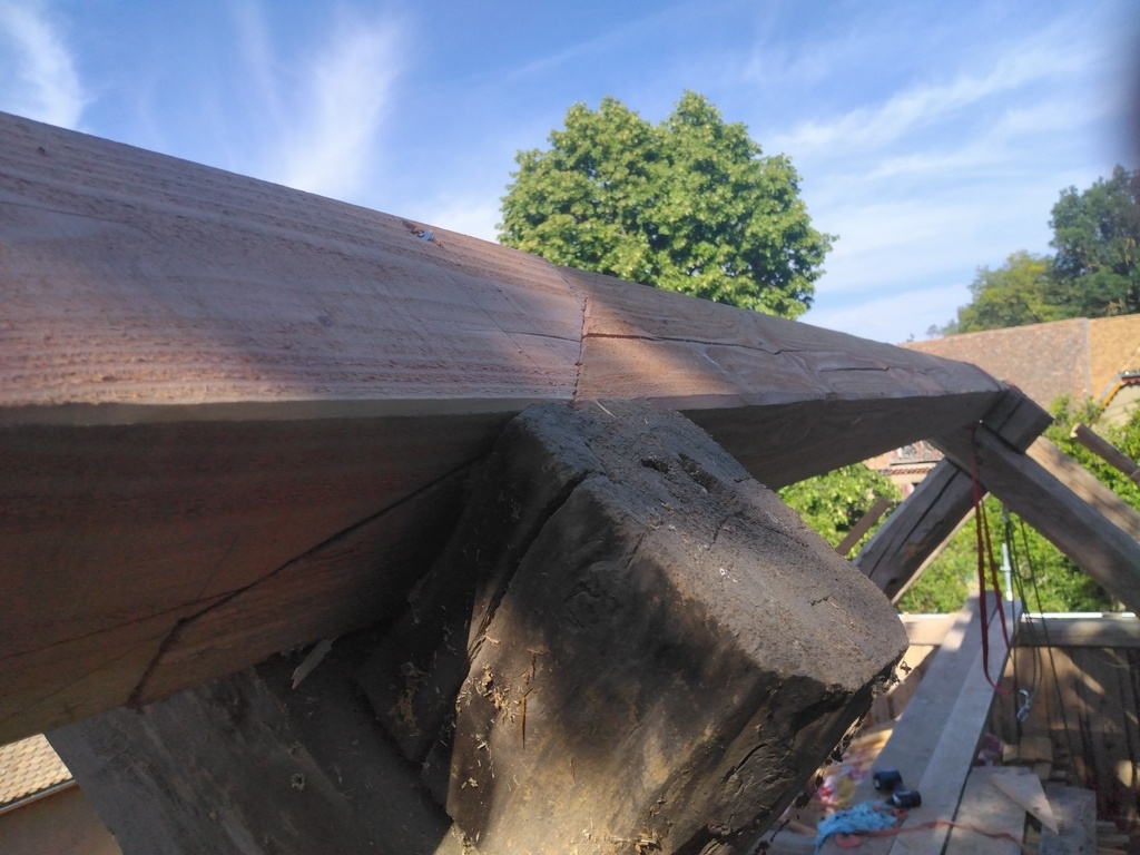 J'avais commencé à changer la 1ere partie en reprenant l'assemblage existant (1ere photo). Mais après avoir découvert l'ensemble du 2eme versant le reste de la faîtière montre aussi des signes de faiblesse. Je vais mettre 2 longueur de 3,5m. Quitte à tout changer, y aurait il un assemblage plus pertinent que celui qui avait été réalisé ?
