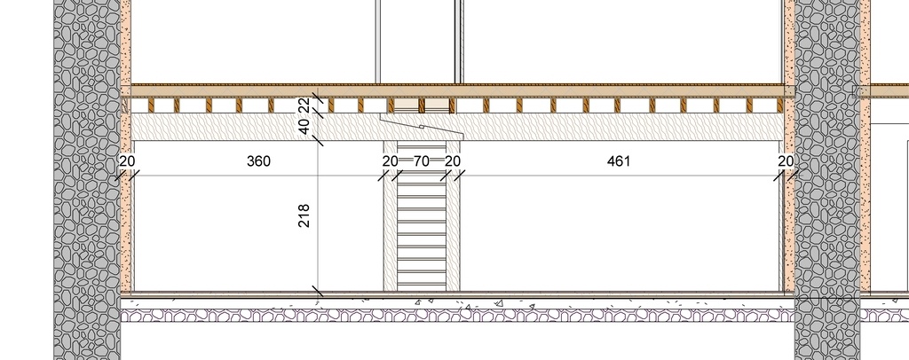 Les poutres/solives sont continues entre les 2 façade, section 22/8cm pour 680cm de portée.