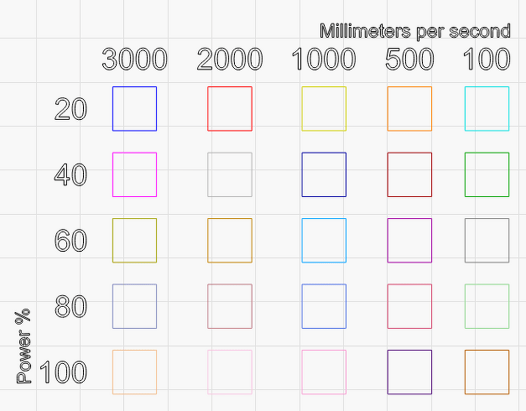 Petite difficulté, j’ai trouvé des générateurs de tests matériaux puissance/vitesse pour Lightburn mais pas pour LaserGRBL.