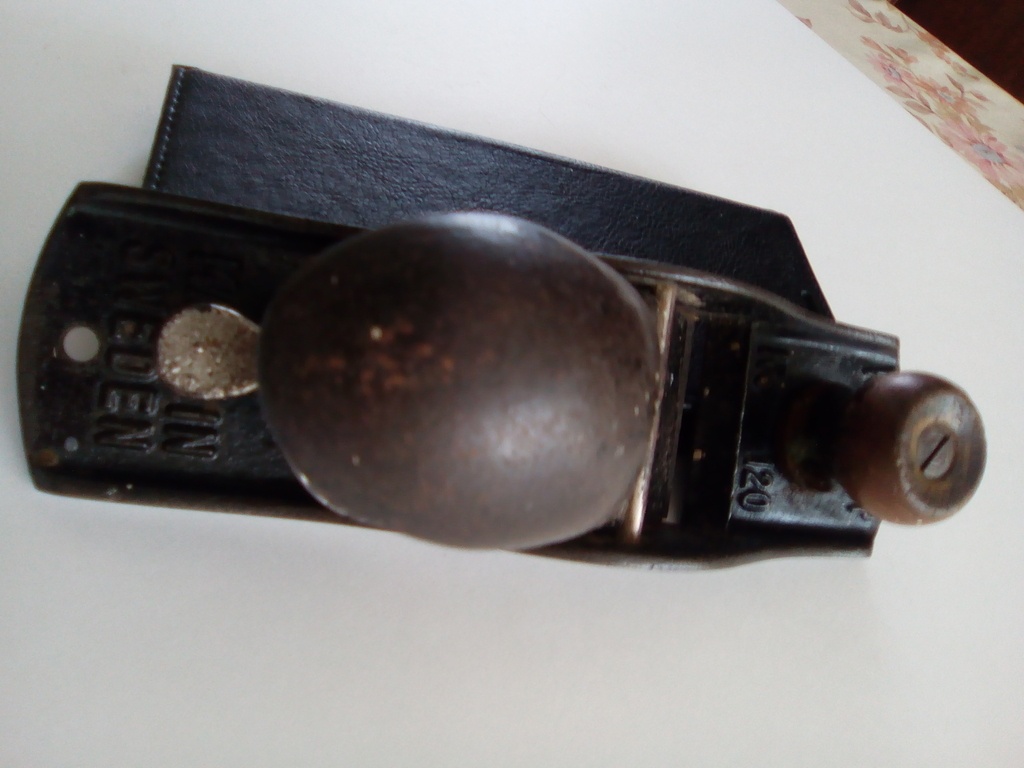 petit rabot trouvé aux "puces" pour la modique somme d'un euro, de marque suédoise ANCHOR n°120 en bon état,il n'y a plus qu'à l'affûter!je ne connaissais pas cette marque .Le réglage du fer s'obtient avec la petite languette métallique pour avancer ou le reculer . Le dessous du fer étant cranté.pour un déplacement latéral ,il faut utiliser un petit marteau.
