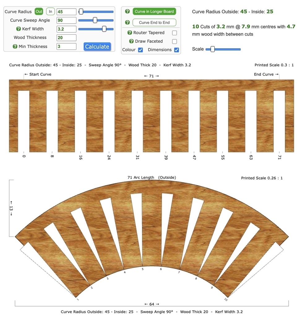 En effet, en donnant quelques valeurs c'est le site qui vous calcul l'espace nécessaire entre les coupes pour pouvoir cintrer votre bois. En prime vous pouvez imprimer à l'échelle 1:1: pour coller sur le bois et faciliter le travail.